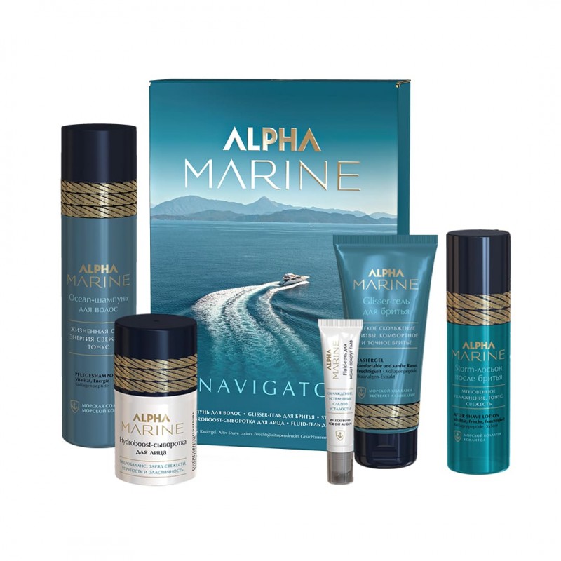 Kit pentru bărbați ESTEL ALPHA MARINE NAVIGATOR, (Șampon, gel pentru bărbierit, loțiune după bărbierit, ser pentru față, gel pentru pielea din jurul ochilor) | eFrumos.md
