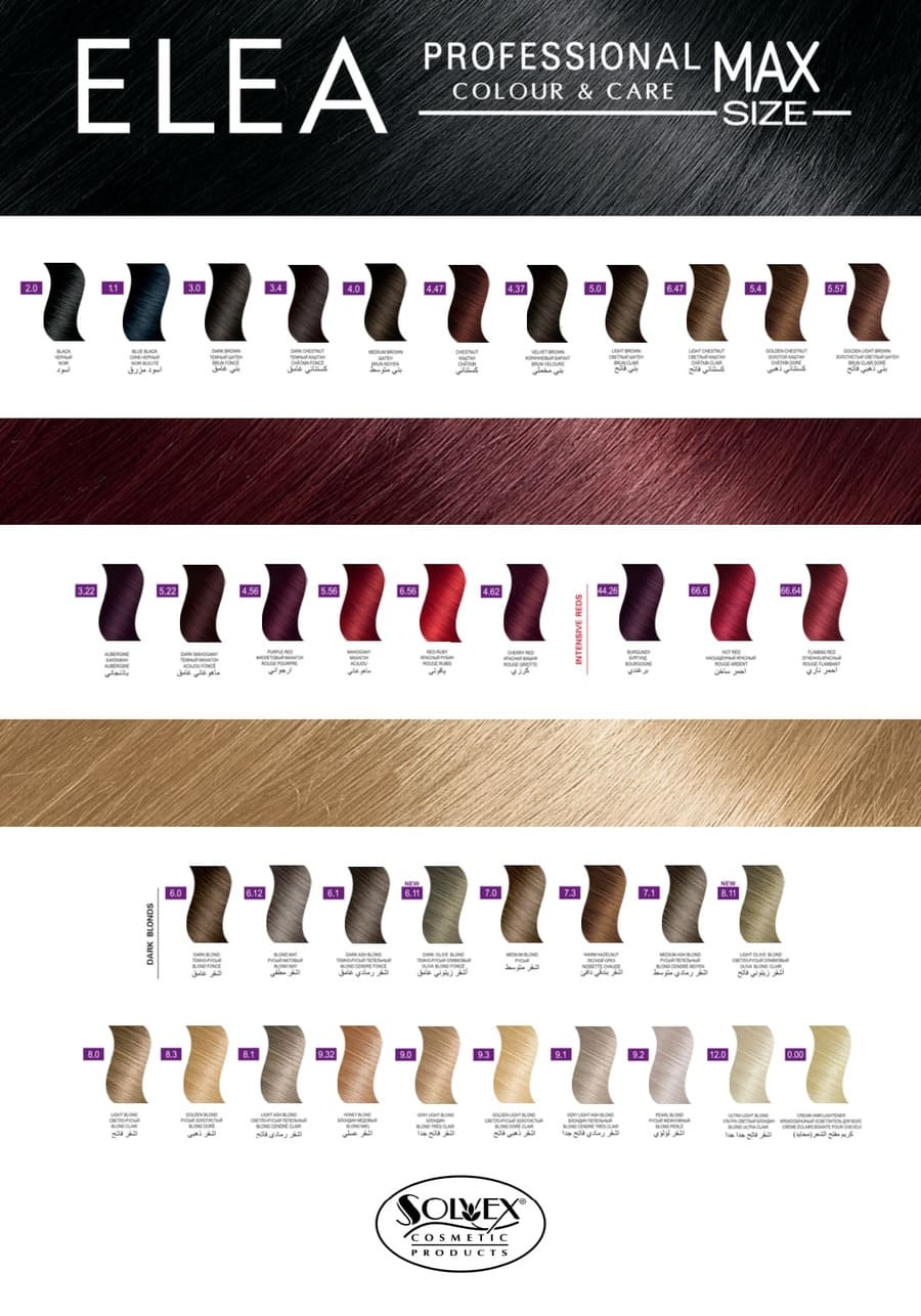 Vopsea cremă permanenta ELEA Professional Color & Care MAX SIZE este îmbogățita cu uleiuri vegetale care asigură pătrunderea ușoară a pigmenților în păr și acoperirea maximă a părului alb. Formula sa cremoasă poate fi aplicată cu ușurință, vopseaua nu curge. Acest colorant de păr oferă o nutriție intensivă și o protecție maximă a părului în timpul vopsirii datorită uleiului din semințe de struguri – bogat în vitamina F și acizi grași esențiali.