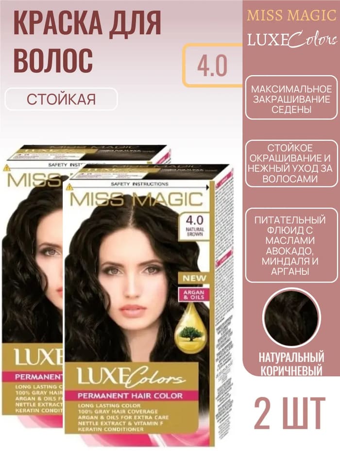 Vopsea permanentă pentru păr Solvex Miss Magic Luxe Colors asigura cea mai bună acoperire a părului gri, culori de lungă durată și îngrijire delicată a părului. Formula sa echilibrată, combinată cu uleiuri prețioase de argan, avocado și migdale, este special concepută pentru pătrunderea perfectă a pigmenților de culoare în păr. Uleiul de argan acționează ca un „supliment nutritiv” – hrănește părul uscat și deteriorat, redându-i finetea și strălucirea naturală. Extractul de urzica, vitamina F si keratina confera parului volum si elasticitate.
